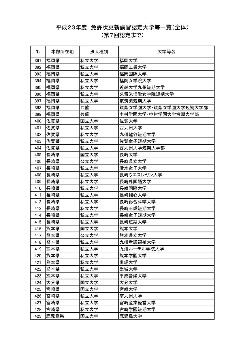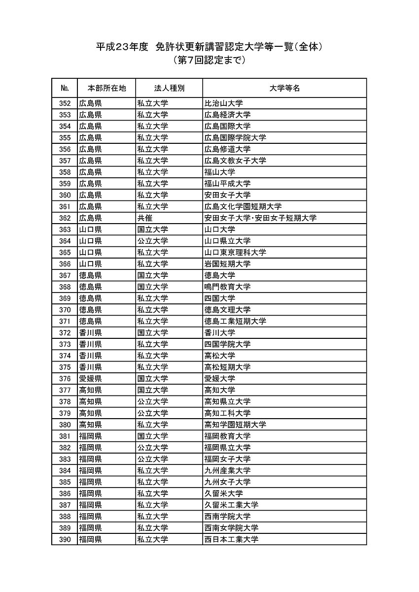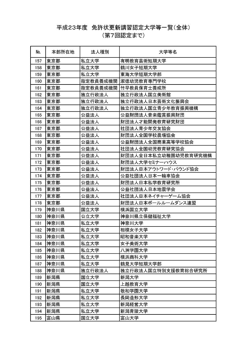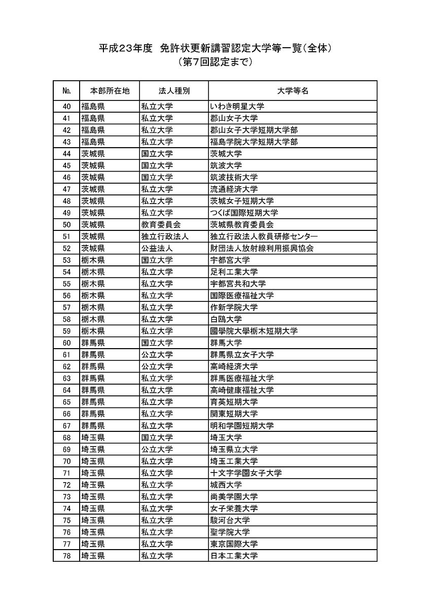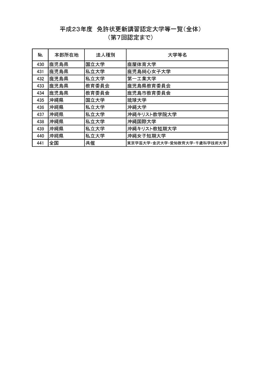 「2011年度教員免許更新・許可大学等名情報(文科省情報)」