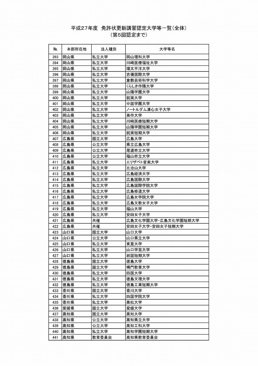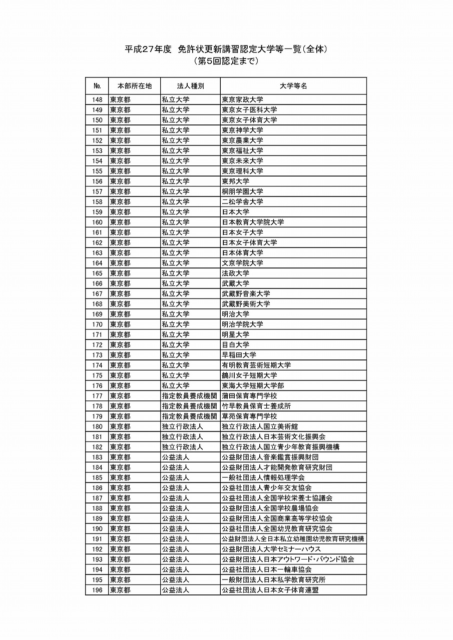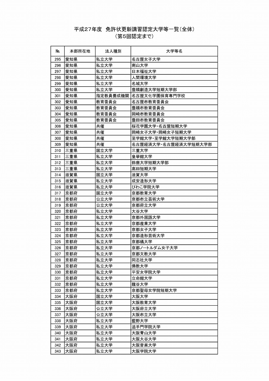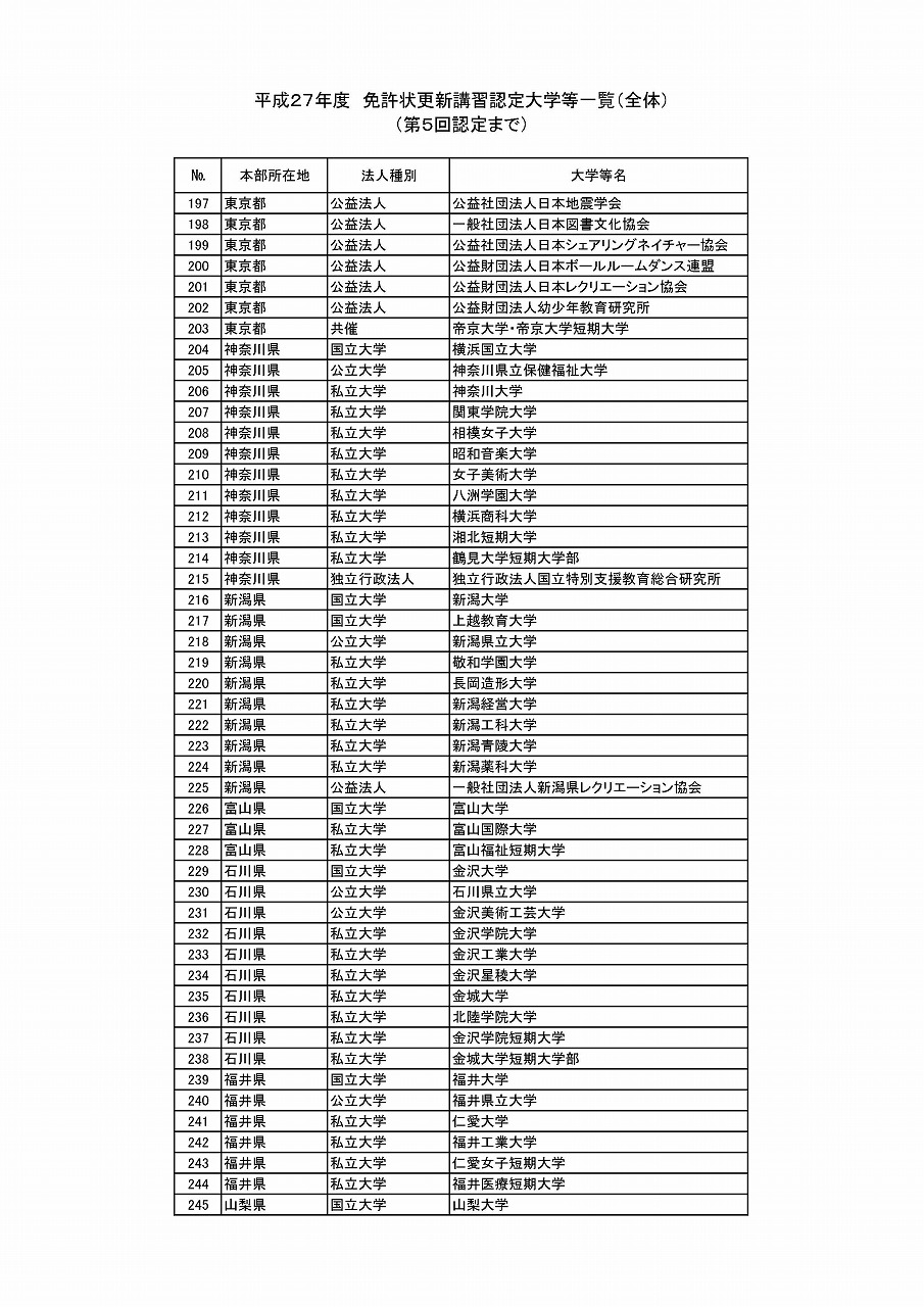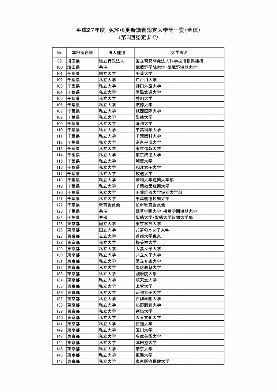 「2015年度教員免許更新・許可大学等名情報(文科省情報)」