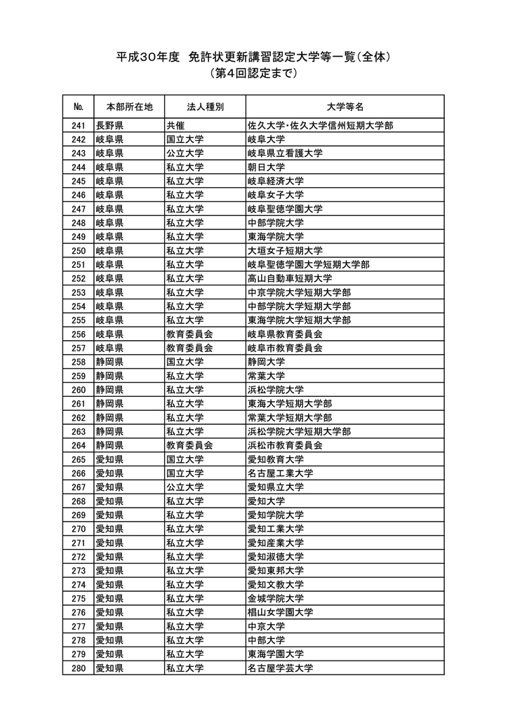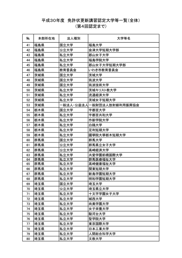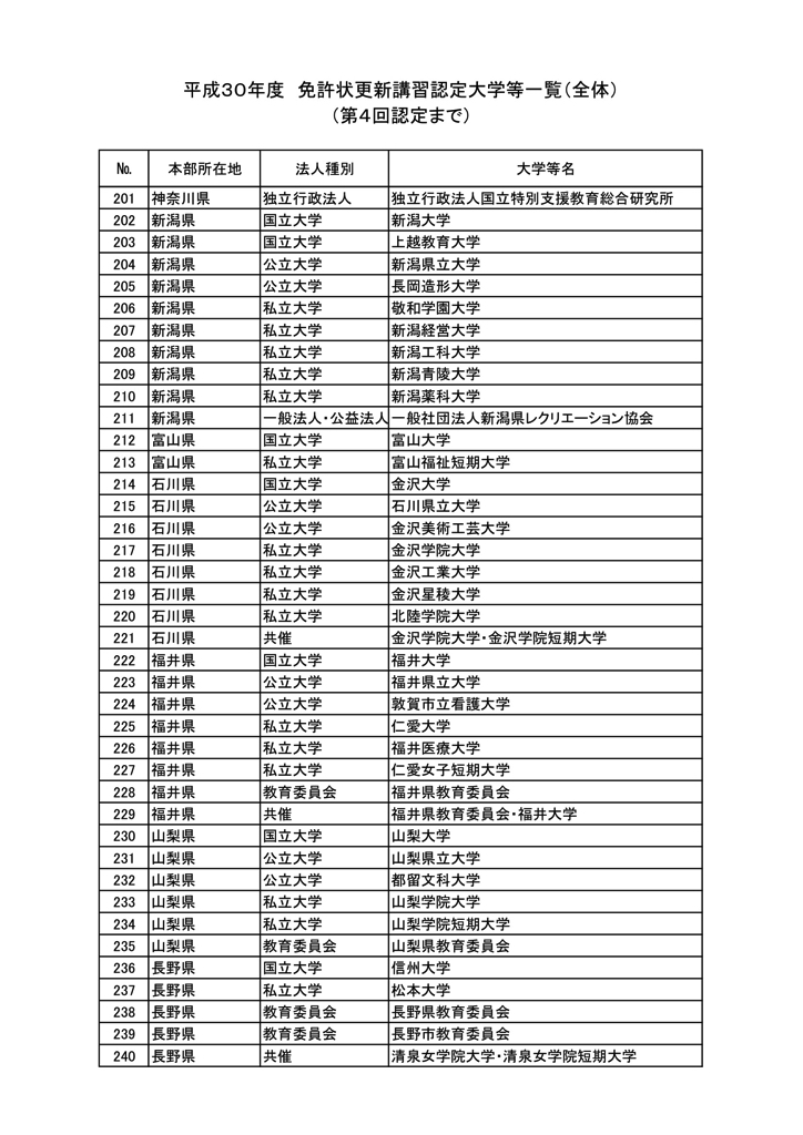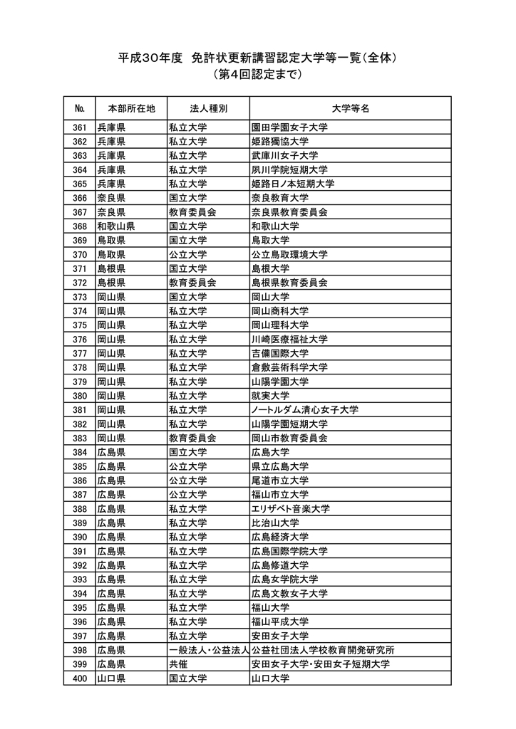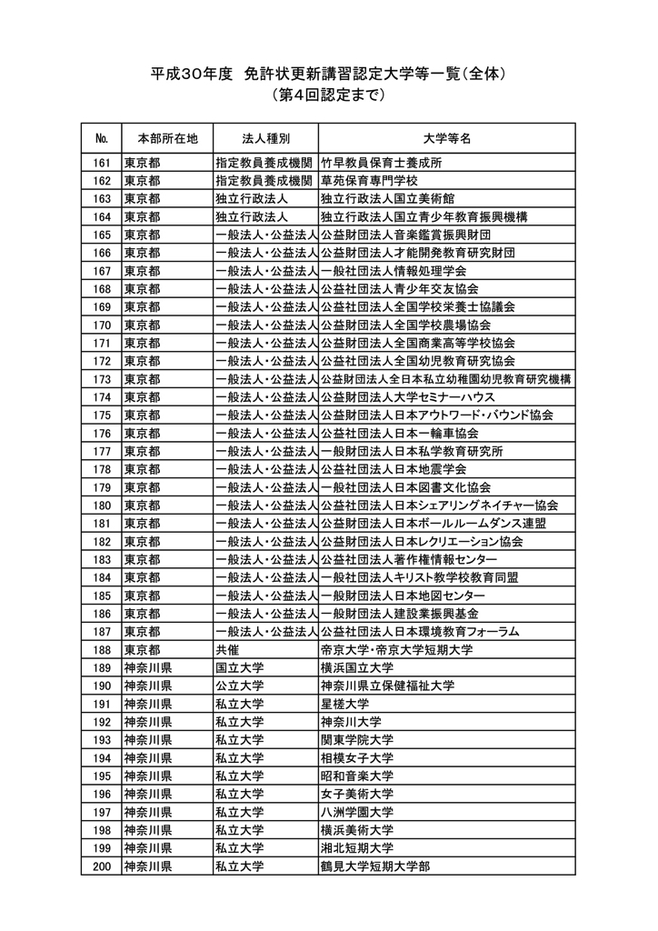 「2018年度教員免許更新・許可大学等名情報(文科省情報)」