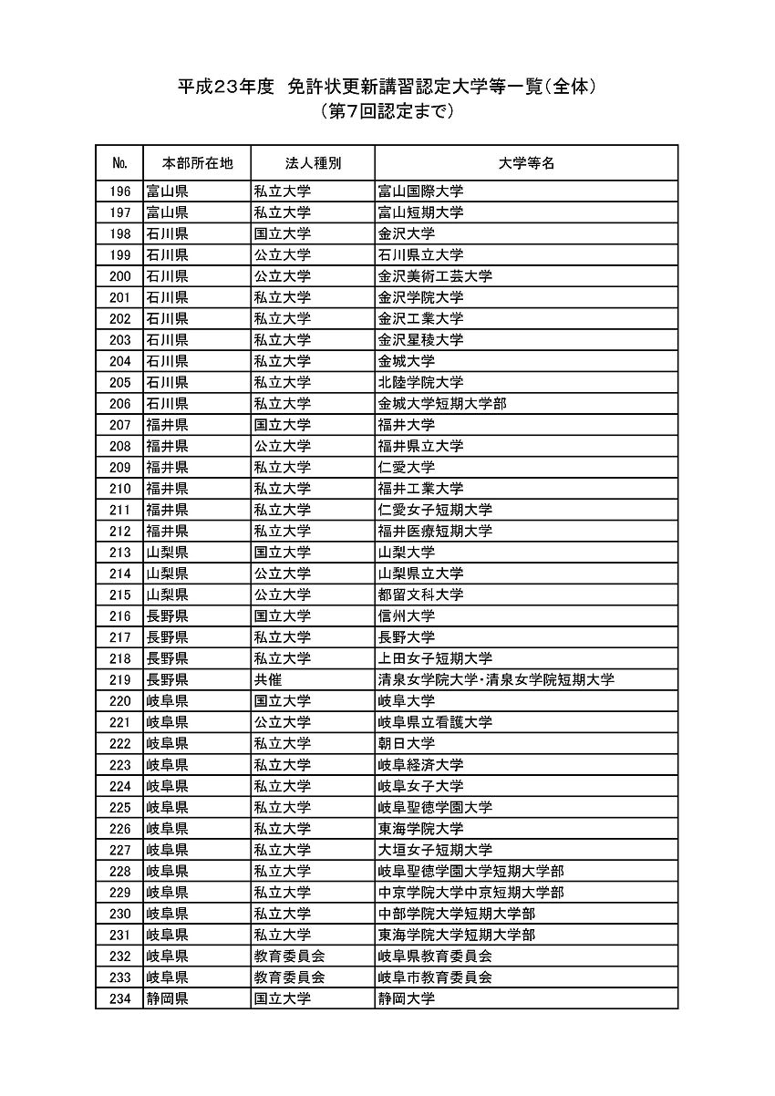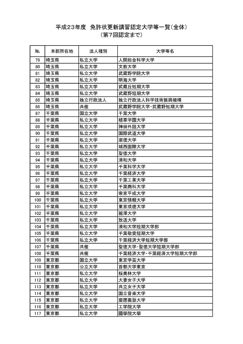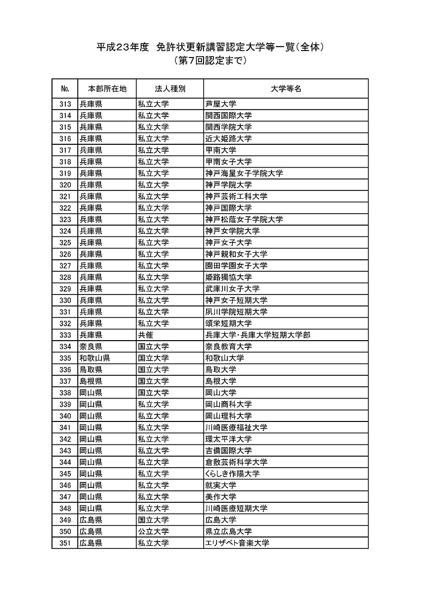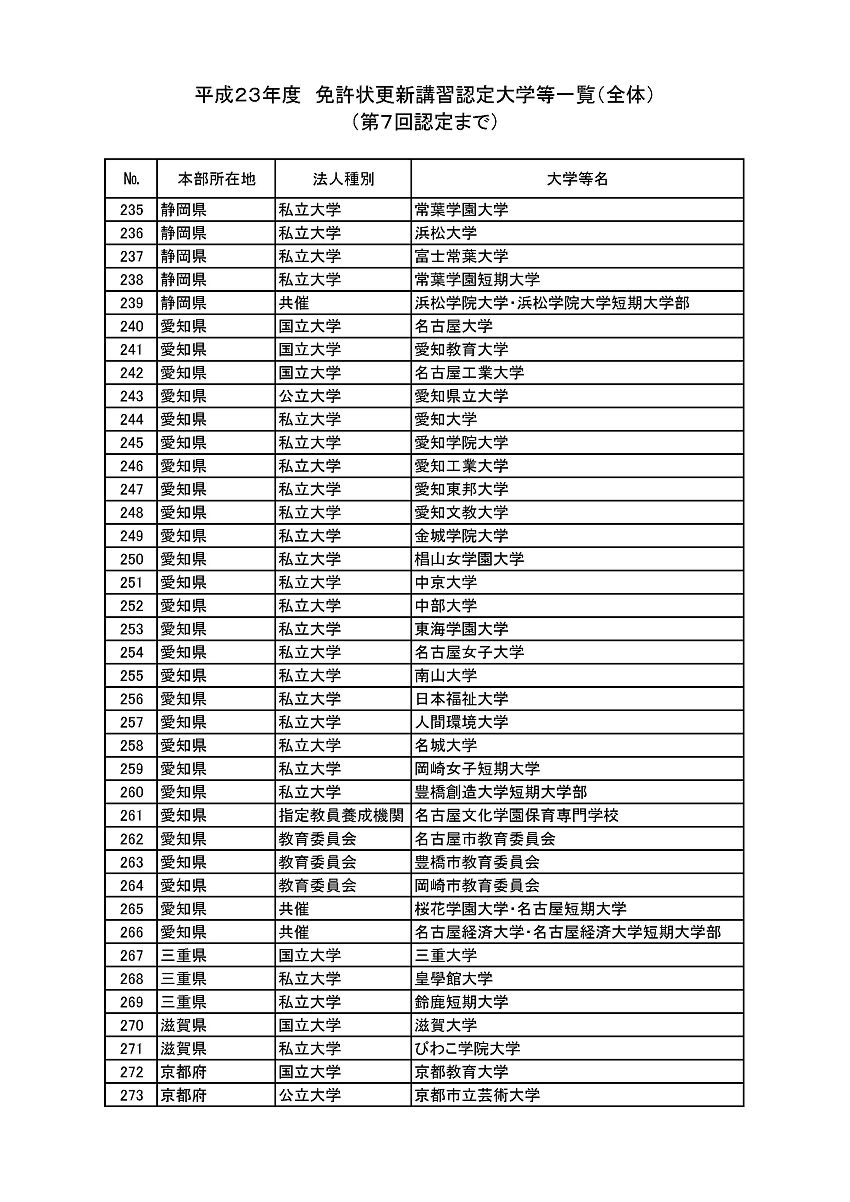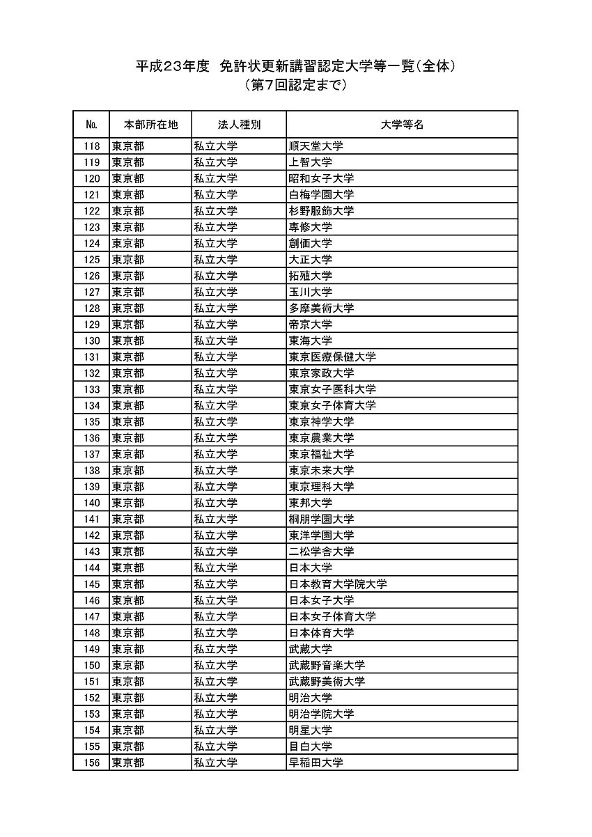 「2011年度教員免許更新・許可大学等名情報(文科省情報)」