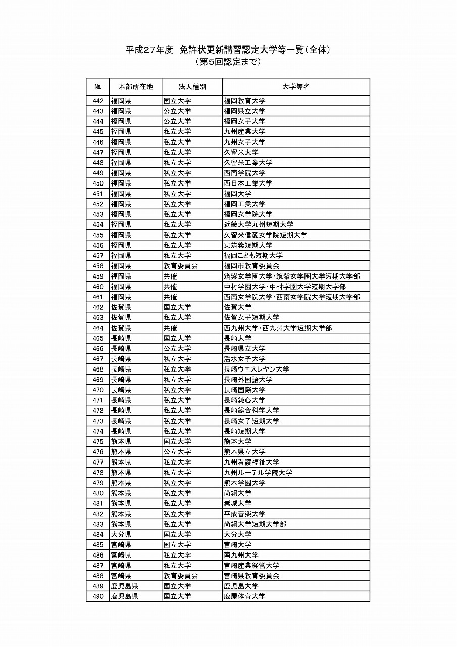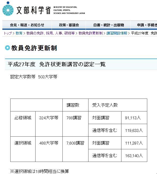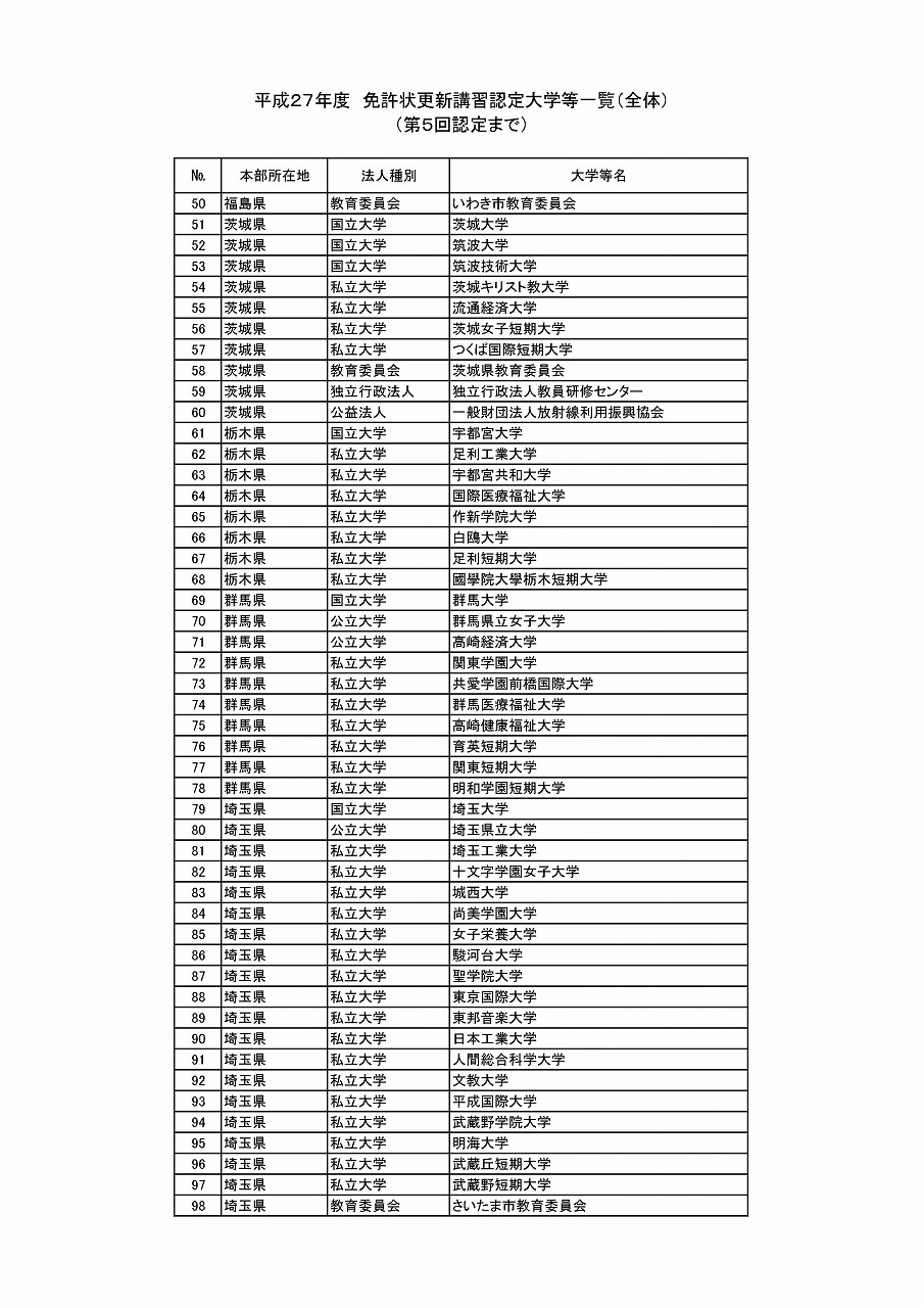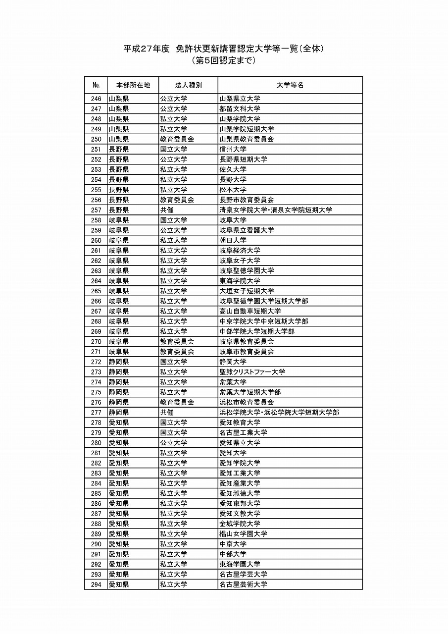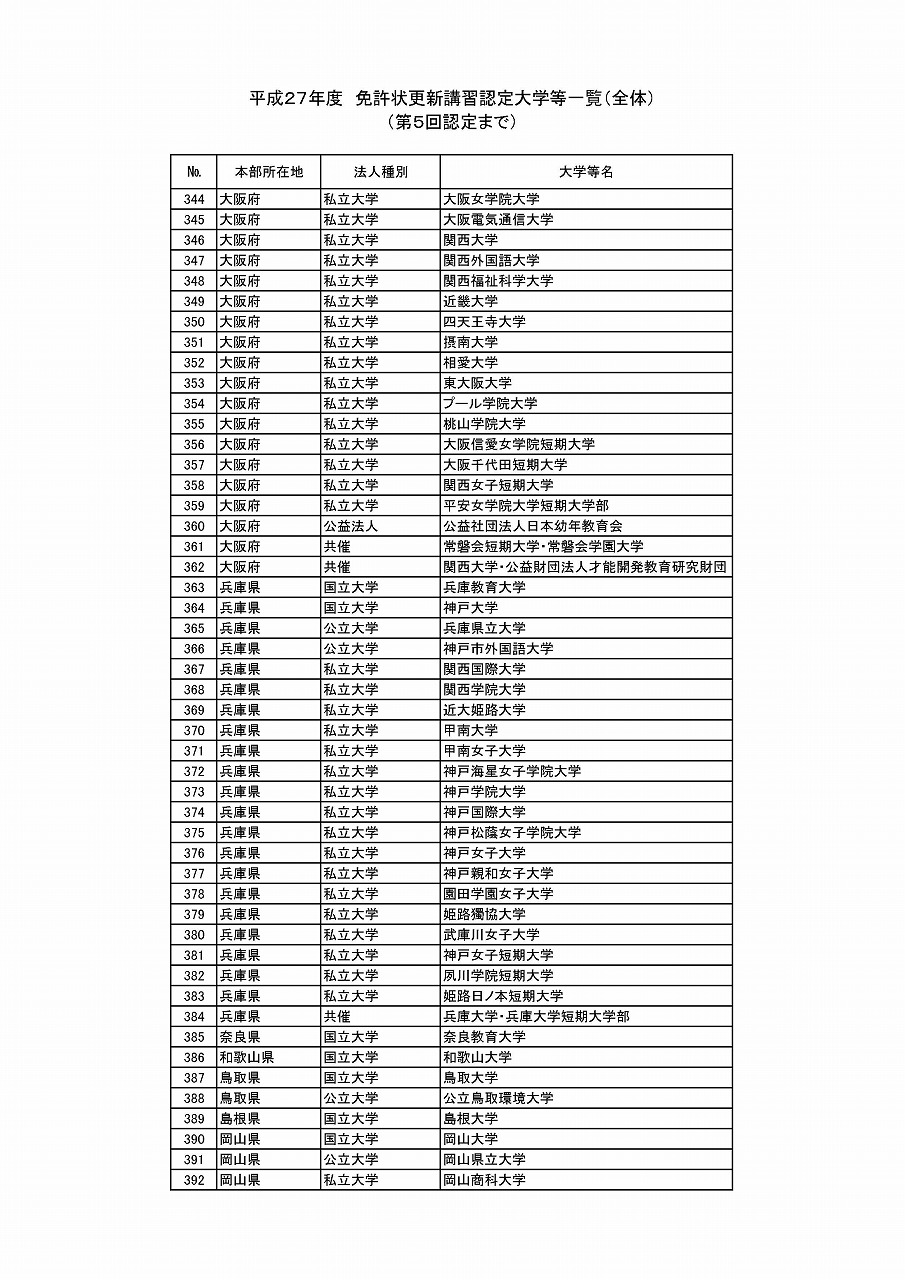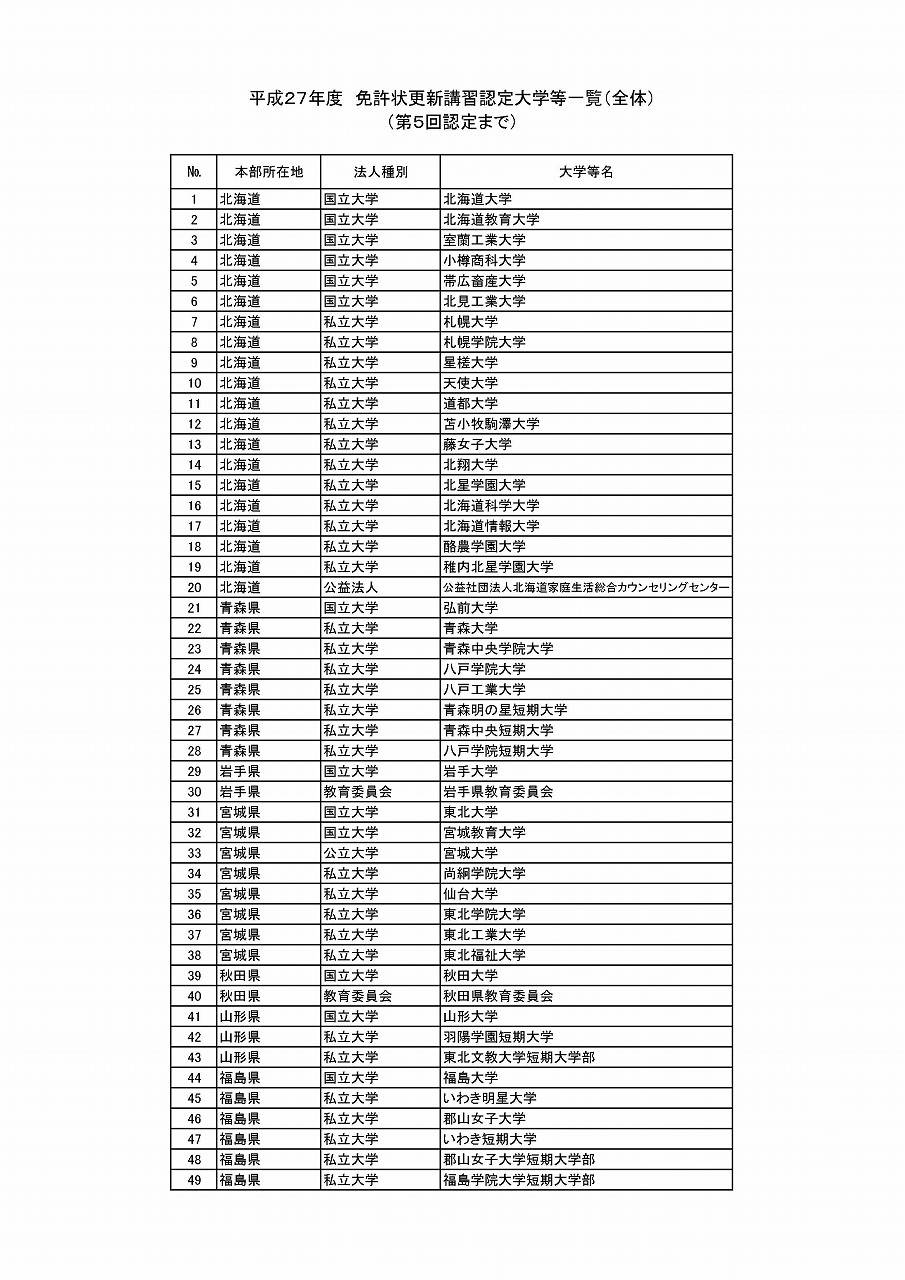 「2015年度教員免許更新・許可大学等名情報(文科省情報)」
