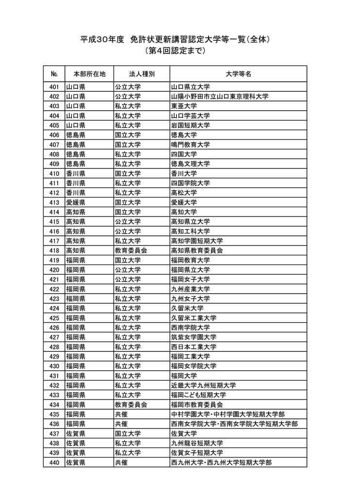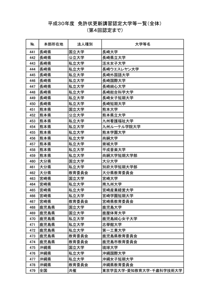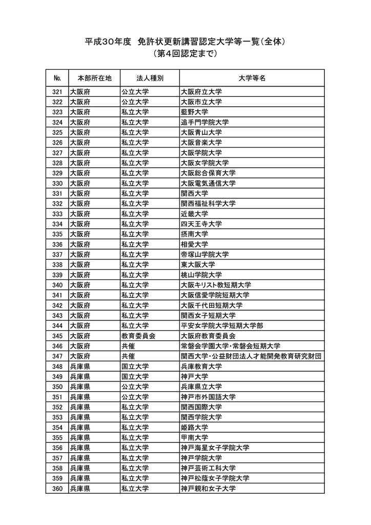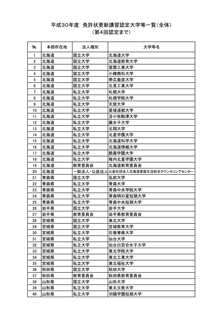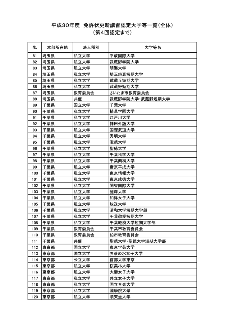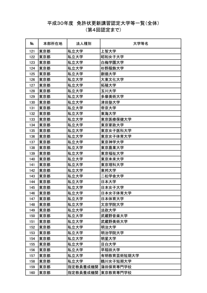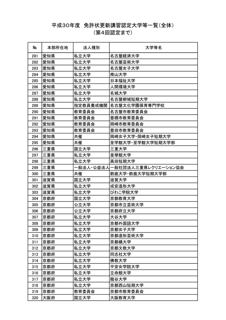 「2018年度教員免許更新・許可大学等名情報(文科省情報)」